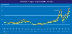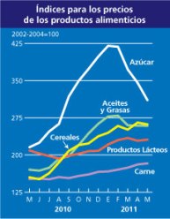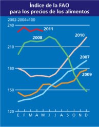» El índice de precios de los alimentos de la FAO registró un promedio de 232 puntos en mayo de 2011, esto es, un descenso del 1 % desde la estimación revisada de 235 puntos en abril y un aumento de un 37 % con respecto a mayo de 2010. La disminución de los precios internacionales de los cereales y del azúcar motivó la ligera disminución del valor medio del índice en mayo, compensando sobradamente los descensos en los precios de la carne y de los productos lácteos, al tiempo que los aceites permanecieron en gran medida sin variación. El índice se ha situado por encima de los 231 puntos desde el inicio del año y llegó a su máximo histórico de 238 puntos en febrero.