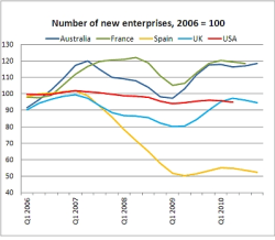 At the other end of the scale, entrepreneurship in some countries, like Australia and France, and to a lesser extent the United Kingdom, has bounced back from the crisis, with the number of firms being created actually higher in 2010 than it was at the pre-crisis peak.