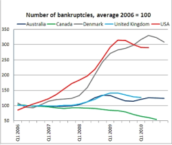Similar trends are apparent for the number of bankruptcy procedures, which increased considerably across the OECD area over the 2008-09 period and continued at high levels through the second quarter of 2010. This was most pronounced in the United States, which saw a radical spike in bankruptcy procedures during the crisis and had yet to return to anything near pre-crisis levels by late-2010, when the number of bankruptcies was still hovering at nearly three times pre-crisis levels.