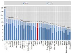 In 2009, there were large variations in how much OECD countries spent on health and the health spending share of GDP. The United States continued to outspend all other OECD countries by a wide margin, with spending on health per capita of $7960. This was two-and-a-half times more than the OECD average of $3223.