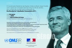 Rio de janeiro, Brasil.- O Sistema das Nações Unidas no Brasil e o Consulado Geral da França no Rio de Janeiro promovem nesta sexta-feira (19/8) a exibição do documentário “Sérgio” para comemorar o Dia Mundial do Trabalhador Humanitário 2011. O filme retrata a vida do brasileiro Sérgio Vieira de Mello, Alto Comissário das Nações Unidas para os Direitos Humanos, que morreu após a explosão de uma bomba na sede das Nações Unidas, no Iraque, no dia 19 de agosto de 2003.