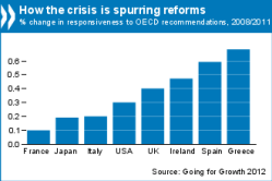 El reporte de la OCDE analiza y compara el progreso que los países han realizado en materia de reformas estructurales desde el inicio de la crisis, abarcando de2007 a2011. Muestra que las reformas se han acelerado allí donde más se requieren – en los países europeos golpeados por las crisis de deuda soberana; Grecia, Irlanda, Portugal y, más recientemente, España e Italia.