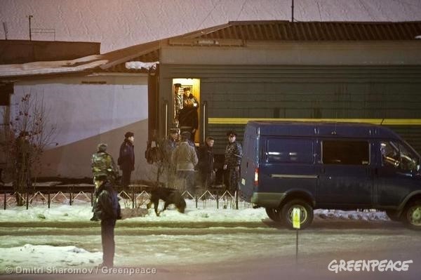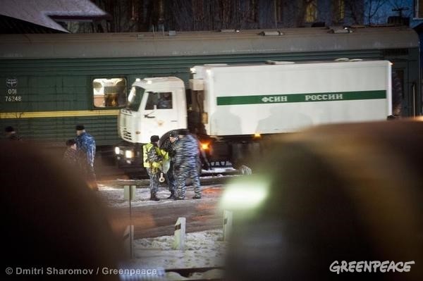 Dima dejó sus fotos en la oficina de apoyo de Múrmansk para su distribución, y partió para cumplir con la siguiente parte de los planes del día: subir al tren en la siguiente parada. Nuestro taxista voluntario estaba más que dispuesto a correr tras el tren y Dima se las arregló para subir y sentarse al fondo, justo al lado del vagón carcelero. A su llegada a San Petersburgo, Dima ideó un plan para quedarse en el tren después de que todos los pasajeros habían descendido, con la esperanza de poder estar cuando bajaran a los detenidos del vagón carcelero. Se escondió en el maletero, cubierto con mantas. En el silencio del vagón vacío, llegó la señora de la limpieza y levantó una manta, para encontrarse con la cara de Dima. Ella comenzó a gritar. Esto atrajo la atención de los guardias de seguridad de la estación. Una vez fuera del tren, Dima se dio cuenta de que el vagón carcelero había sido desenganchado, y que su vigilia había sido en vano. El guarda exigió ver su pasaje. Dima se lo entregó y este lo miró de arriba abajo. Luego le preguntó si tenía algo que ver con los activistas de Greenpeace que acababan de llegar. Con la cámara en su mochila y su coartada descubierta, Dima pensó que lo mejor era decir la verdad. «Sí», murmuró. El guarda le dio una mirada cómplice, colocó sus dos pulgares hacia arriba, y le dijo: » Váyase entonces. Y buena suerte».