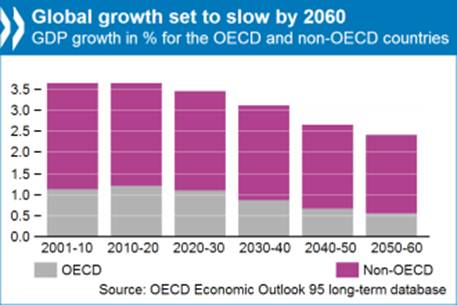 Las poblaciones de la tercera edad en muchos países miembros de la OCDE, así como la desaceleración gradual de las altas tasas de crecimiento actuales en las grandes economías emergentes, traerán aumentos globales al PIB de un promedio anual del 3.6% en el periodo de 2010-2020 hasta un estimado de 2.4% para 2050-2060. La innovación y la inversión en habilidades serán los elementos predominantes que dirijan el crecimiento.