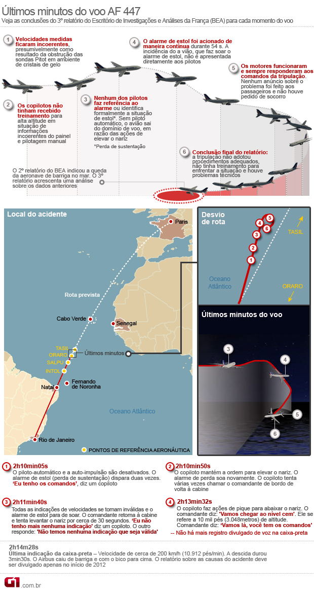 La Agencia de Investigaciones de Accidentes de Francia (BEA) descubrió que los sensores de velocidad externos se congelaron y emitieron lecturas erróneas a la aeronave, que perdió altura rápidamente. Además el capitán no estaba en la cabina de mando.