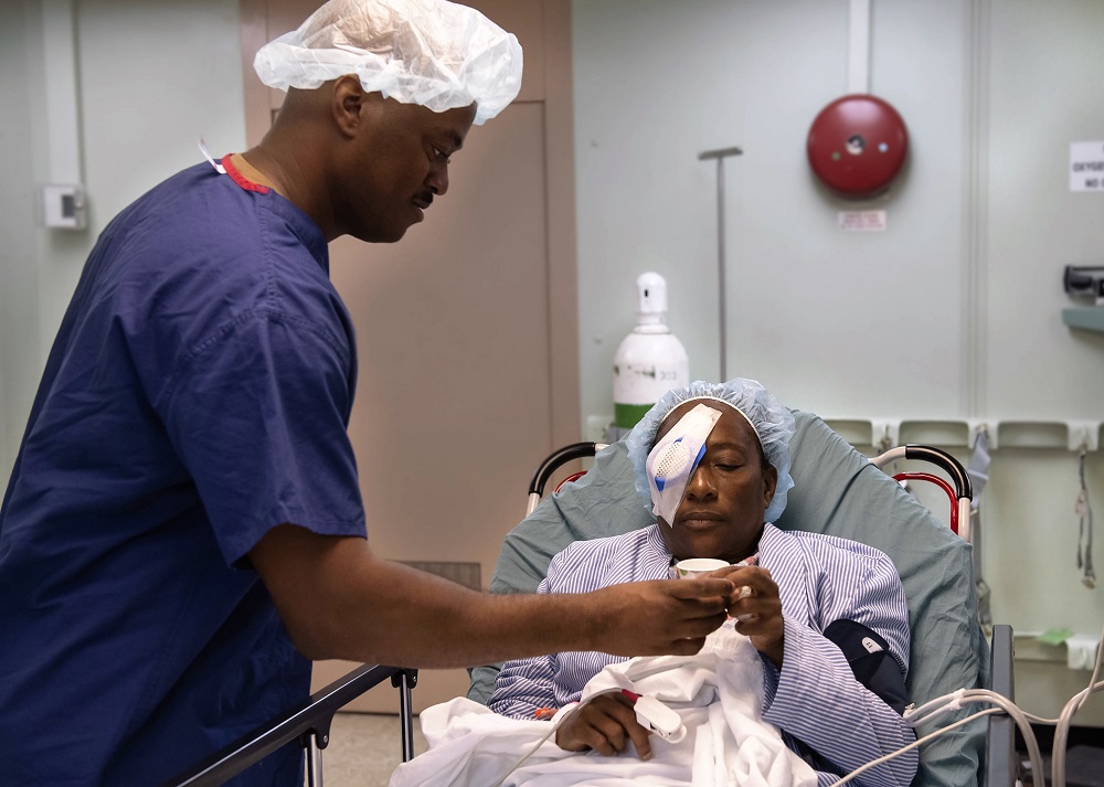 El Teniente de Navío de la Marina de los EE. UU. Alan Chambers, enfermero, ofrece un vaso de agua a una mujer, después de su cirugía. (Contramaestre Segunda Clase de la Marina de los EE. UU. Morgan K. Nall)