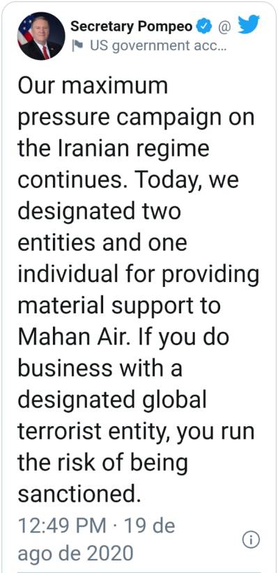 Nuestra campaña de máxima presión sobre el régimen iraní continúa. Hoy hemos designado a dos entidades y a un individuo por proporcionar apoyo material a Mahan Air. Si usted hace negocios con una entidad designada como entidad terrorista global usted corre el riesgo de ser sancionado.