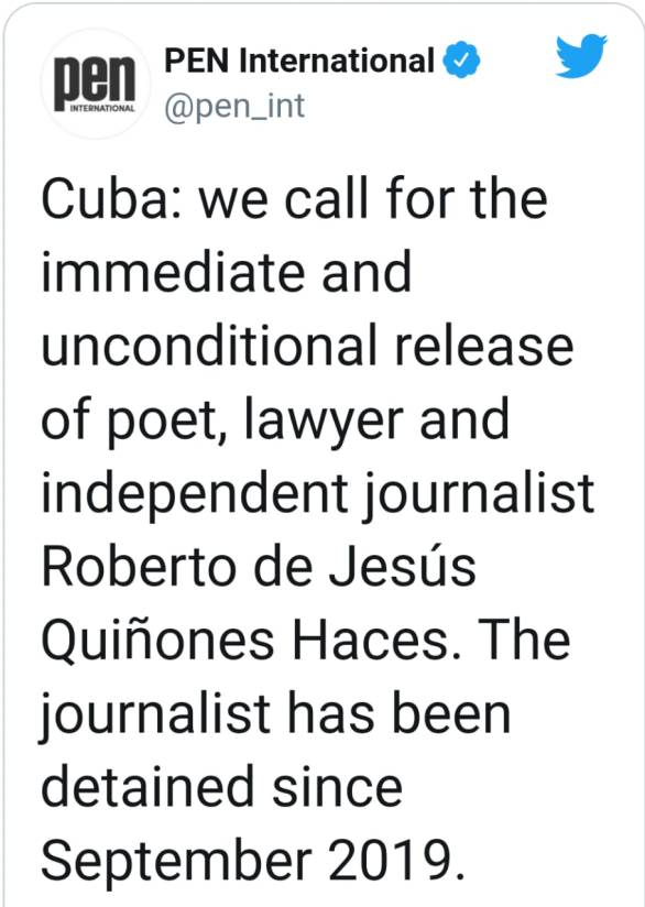 Cuba: hacemos un llamado a la liberación inmediata e incondicional del poeta, abogado y periodista independiente Roberto de Jesús Quiñones Haces. El periodista lleva detenido desde septiembre de 2019.
