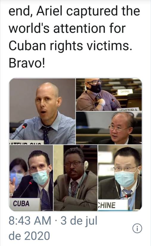El biólogo cubano y antiguo preso político, el Dr. Ariel Ruiz Urquiola habla ahora en las Naciones Unidas. Cuba y otras dictaduras: China, Corea del Norte, Eritrea, Venezuela, intentaron silenciarlo. Al final, Ariel capturó la atención del mundo para las víctimas de los derechos humanos en Cuba. ¡Bravo!