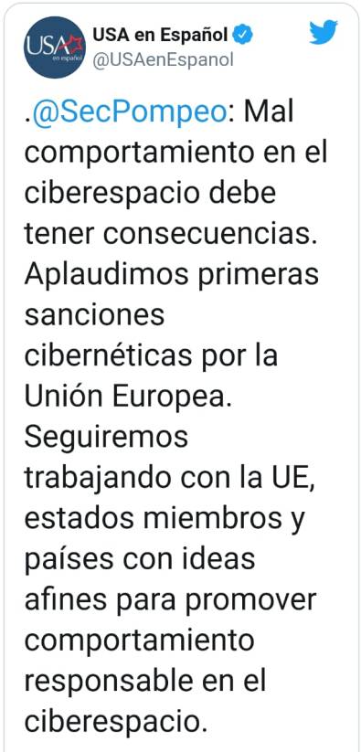 El ministro de Asuntos Exteriores de la Unión Europea, Josep Borrell comentó que las ciberamenazas aumentan y evolucionan, y afectan a nuestras sociedades al anunciar las primeras sanciones en un tuit el 30 de julio, e indicó que no se va a tolerar tal comportamiento.