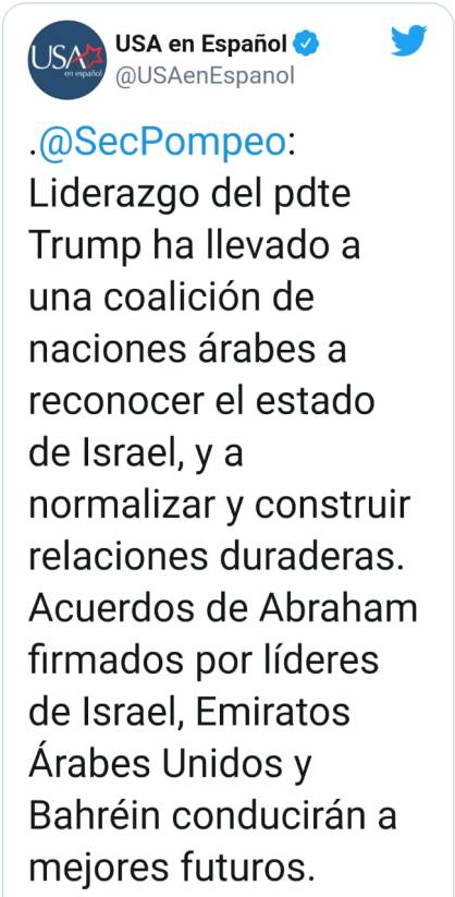 “Tal como el presidente lo estableció al principio de esta administración, fortalecerá las amistades de Estados Unidos y creará nuevas asociaciones en busca de la paz”, dijo Pompeo en una declaración del 11 de septiembre. “Cumplió su promesa”.