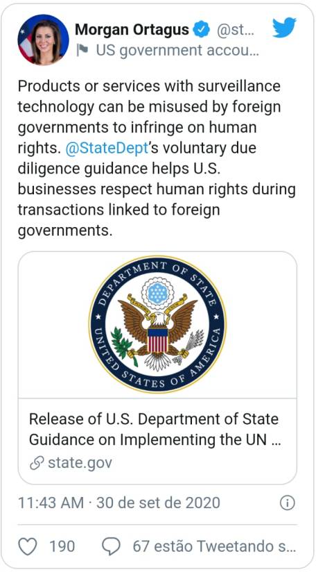 Los productos o servicios con tecnología para vigilancia pueden ser mal utilizados por gobiernos extranjeros para contravenir los derechos humanos. La guía voluntaria del Departamento de Estado (@StateDept) sobre diligencia debida ayuda a las empresas estadounidenses a respetar los derechos humanos en las transacciones vinculadas con gobiernos extranjeros.