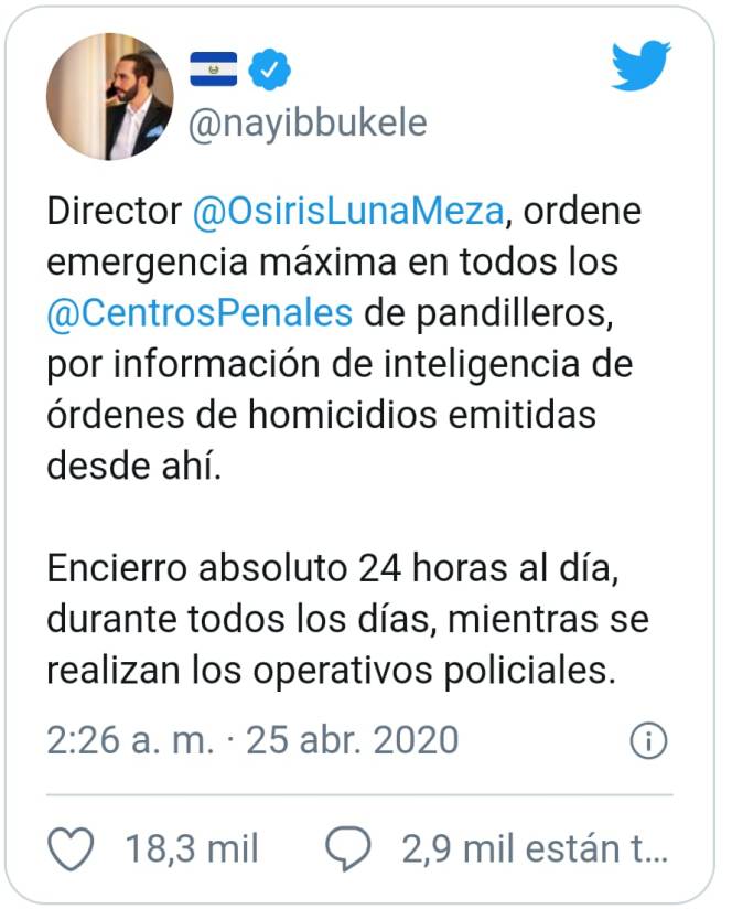 El pasado 26 de abril, el presidente de El Salvador, Nayib Bukele, publicó en su cuenta de Twitter una autorización para que la policía y el ejército, usaran la «fuerza letal para la defensa propia o para la defensa de la vida de los salvadoreños».