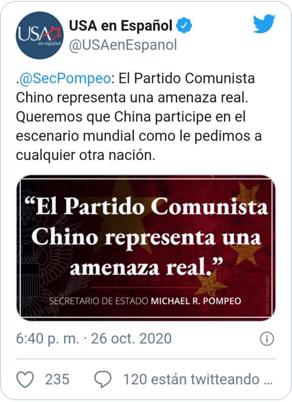 El secretario de Estado adjunto de Estados Unidos para Asuntos del este de Asia y el Pacífico, David Stilwell, indicó en un discurso el 30 de octubre que el PCC quiere establecer las reglas para todo el mundo en lugar de seguir un orden basado en reglas que permita la solución pacífica de disputas entre países soberanos.
