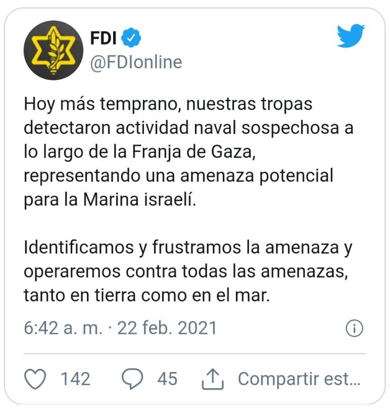 El comunicado agrega además que las tropas israelíes lograron neutralizar la amenaza y que el incidente tuvo lugar en las costas palestinas.