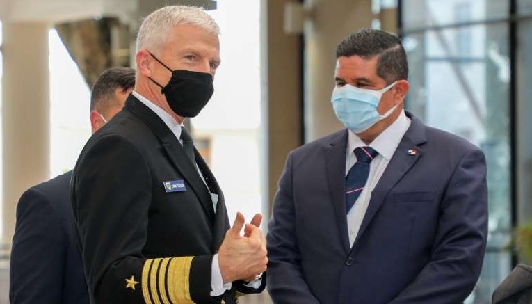 En el país centroamericano [el Almte.] Faller se reunió con el presidente Laurentino Cortizo y su ministro de Seguridad, Juan Pino, para abordar asuntos de ciberseguridad, seguridad de fronteras y seguridad marítima.