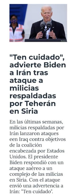 Es el primer ataque reportado desde que Estados Unidos atacó la semana pasada objetivos de una milicia vinculada a Irán en la frontera entre Siria e Irak. La sucesión de ofensivas avivó el temor a que se repita la escalada de represalias registrada el año pasado, y que terminó con un ataque estadounidense que mató al general iraní Qassim Soleimani junto al aeropuerto de Bagdad.
