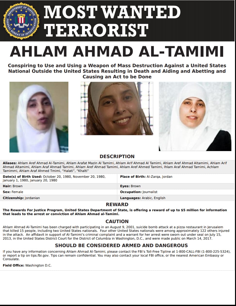 Agencia AJN / Edición Oipol / Foto Departamento de Justicia de Estados Unidos, escritura en idioma inglés – Tamimi fue arrestada y encarcelada por su papel en el atentado terrorista, donde fallecieron 15 personas, incluidos ocho niños. Sin embargo, fue liberada en 2011 durante el intercambio de prisioneros por el soldado israelí Gilad Shalit.
