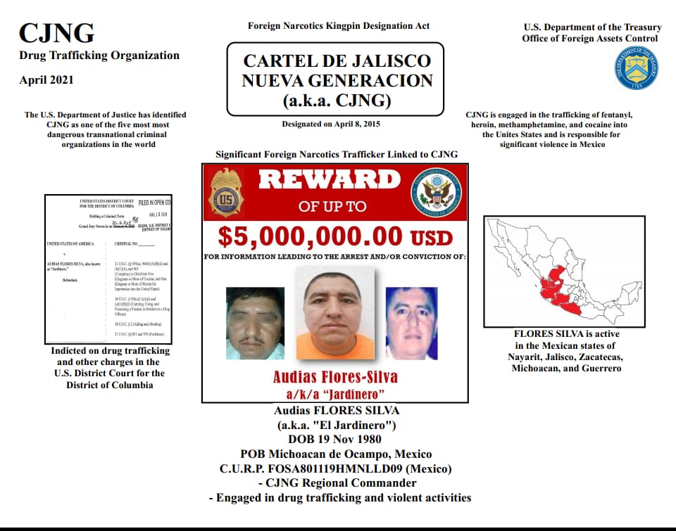 Flores Silva (alias «Jardinero») es uno de los comandantes regionales del Cártel de Jalisco Nueva Generación (CJNG) que controla grandes porciones del territorio del CJNG a lo largo de la costa del Pacífico de México, incluido el estado de Nayarit. CJNG es una violenta organización mexicana de narcotráfico responsable del tráfico de una proporción significativa del fentanilo y otras drogas mortales que ingresan a Estados Unidos. La OFAC tomó esta acción en coordinación con el Departamento de Justicia, que abrió una acusación contra Flores Silva. La OFAC también coordinó con el Departamento de Estado, que ha anunciado una recompensa de hasta $5 millones por información que conduzca al arresto o condena de Flores Silva.