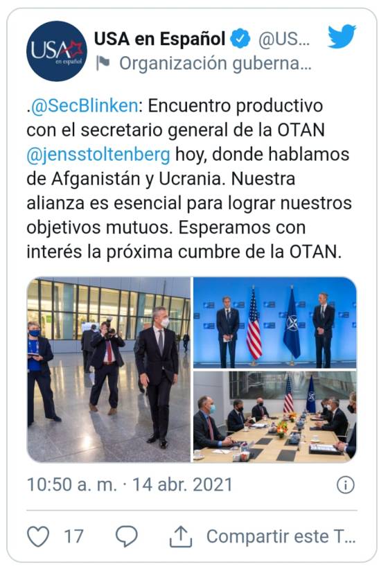 El secretario de Estado, Antony J. Blinken, dijo a la prensa tras la reunión del 14 de abril de la Organización del Tratado del Atlántico Norte (OTAN) en Bruselas que los representantes de 30 países aliados se oponen unánimemente a la expansión militar de Rusia y quieren que Moscú rebaje las tensiones.