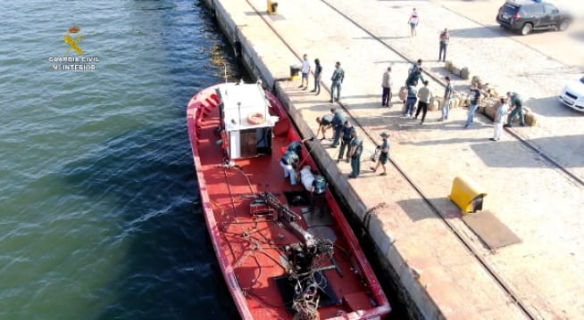 Oipol Operativa en España / Nota y fotos de la Guardia Civil, 20/08/2021 / Edición Oipol – La Guardia Civil, en la operación FILHO, ha detenido en Huelva (ciudad portuaria del suroeste de España) a los dos tripulantes de un barco pesquero cuando transportaban cuatro toneladas de hachís.