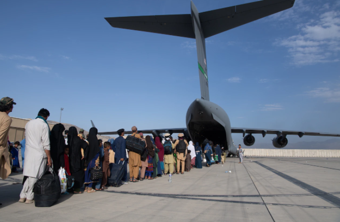 Loadmasters de la Fuerza Aérea y pilotos asignados al 816th Escuadrón Aéreo Expedicionario, carga de pasajeros a bordo de un US Air Force C-17 Globemaster III en apoyo de la evacuación de Afganistán en el Aeropuerto Internacional Hamid Karzai, Afganistán, 24 de agosto de 2021.