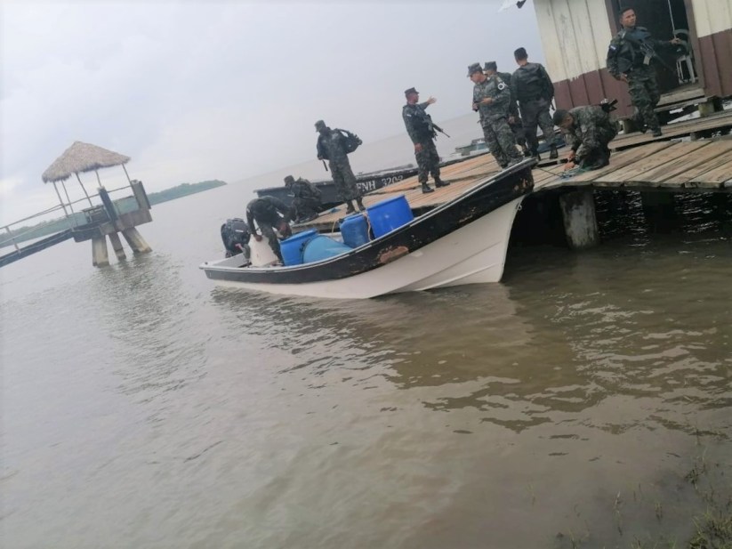En las últimas horas mediante operaciones militares en el Escudo Naval se aseguró en Yahurabila, departamento de Gracias a Dios una embarcación con 19 recipientes de cinco galones cada uno conteniendo supuesta pasta para la elaboración de cocaína.