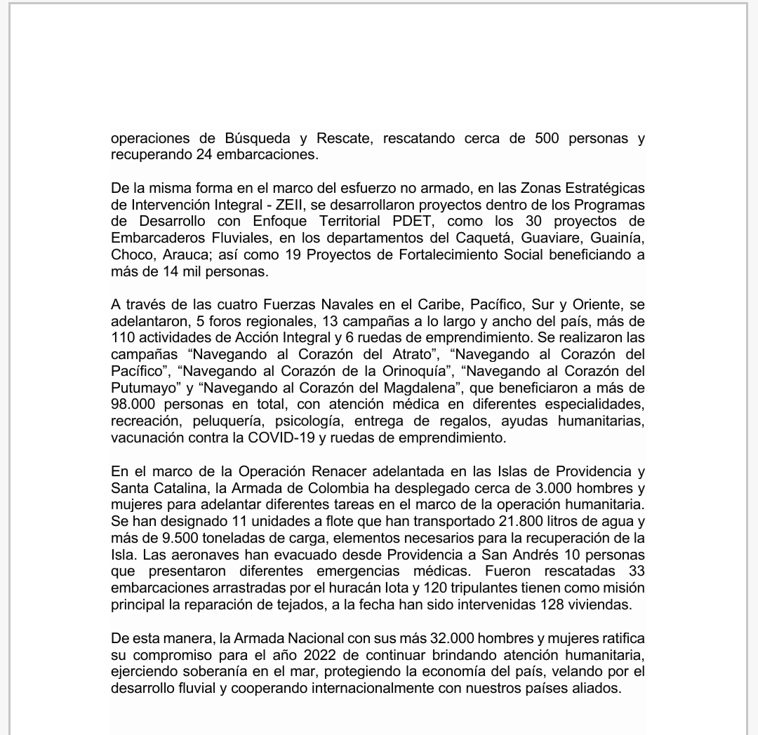 De esta manera, la Armada Nacional con sus más 32.000 hombres y mujeres ratifica su compromiso para el año 2022 de continuar brindando atención humanitaria, ejerciendo soberanía en el mar, protegiendo la economía del país, velando por el desarrollo fluvial y cooperando internacionalmente con nuestros países aliados.