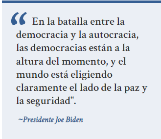 «En la batalla entre la democracia y la autocracia, las democracias están a la altura del momento y el mundo está eligiendo claramente el lado de la paz y la seguridad», dijo. «Esta es una prueba real. Va a llevar tiempo. Así que sigamos inspirándonos en la férrea voluntad del pueblo ucraniano».