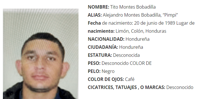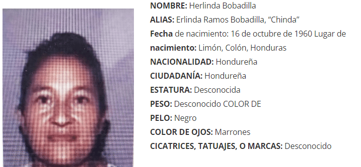 El 8 de octubre de 2015, un gran jurado federal emitió una acusación para (*)Tito Montes Bobadilla, alias Alejandro Montes Bobadilla o Pimpi, de 32 años; Herlinda Bobadilla, alias (*)Erlinda Ramos Bobadilla o Chinda, de 61 años; (*)Juan Carlos Montes Bobadilla, alias Mono, de 35 años; Noe Montes Bobadilla alias Ton, 38; y otros dos supuestos partícipes de la distribución de cinco kilogramos o más de cocaína. El Departamento de Estado está ofreciendo $5 millones por información que conduzca al arresto y/o condena de Tito Montes Bobadilla, Herlinda Bobadilla o Juan Carlos Montes Bobadilla. Los tres Bobadillas están actualmente prófugos y se cree que están armados y son peligrosos.