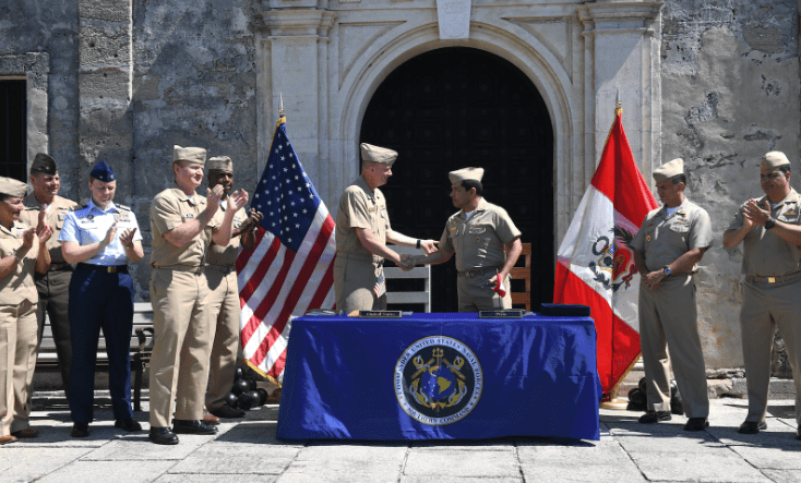 Oipol operando en las Américas | Comunicación y foto de la Fuerza de Trabajo del Comando Sur de Estados Unidos (SOUTHCOM), por el suboficial de primera clase Steven Khor, Junio 6 de 2022 | Traducción y edición Oipol, junio 7 de 2022 – S T. Agustín, Florida – El Comandante del Comando Sur de las Fuerzas Navales de los Estados Unidos / Cuarta Flota, Contralmirante Jim Aiken, recibió a los delegados de la marina peruana (Marina de Guerra del Perú) para la 28.ª Charla Anual del Personal Marítimo (MST), en St. Francis Barracks, Florida National Cuartel General de la Guardia en St. Augustine, del 1 al 3 de junio de 2022.