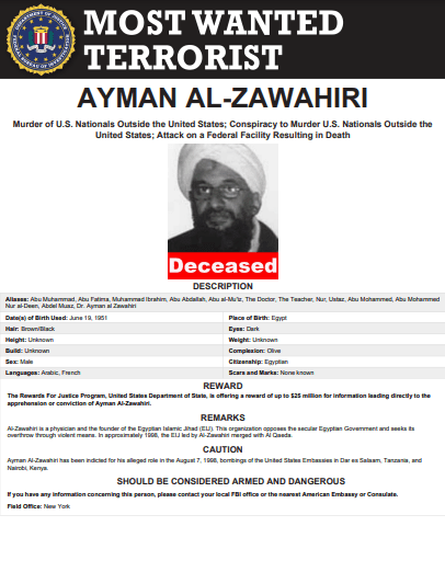 Zawahiri lideró el grupo terrorista al-Qaeda tras la muerte de Osama bin Laden, desde el 2 de mayo de 2011, cuando se procedió a la eliminación del terrorista en Abbottabad, Pakistán. Zawahiri se había desempeñado como lugarteniente de bin Laden y ayudó a planear ataques terroristas contra Estados Unidos y estadounidenses en el mundo. Estos atentados incluyeron el ataque al USS Cole, en Yemen, en año 2000, que mató a 17 marineros e hirió a muchos otros, como también proyectó los ataques a las embajadas estadounidenses en Tanzania (en agosto de 1998) y Kenia (en 2000), matando a 224 personas e hirió a más de 4.500. “Él abrió un camino de asesinato y violencia contra ciudadanos estadounidenses, miembros del servicio estadounidenses, diplomáticos estadounidenses e intereses estadounidenses”, indicó el presidente Biden en un comunicado.