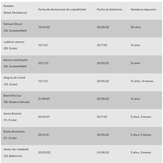 Este caso fue investigado por la Oficina de Residentes de Gainesville de la Administración de Control de Drogas (DEA) con el apoyo de la Oficina Federal de Investigaciones, la Oficina del Sheriff del Condado de Marion, el Equipo de Ataque Unificado de Control de Drogas, la Oficina del Sheriff del Condado de Alachua y el Departamento de Policía de Gainesville. Fue procesado por la Oficina del Fiscal Federal para el Distrito Medio de Florida. Se puede encontrar más información sobre este caso en https://www.flmd.uscourts.gov o https://ecf.flmd.uscourts.gov