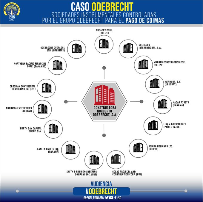 El fiscal Daud indicó que el grupo Odebrecht actuaba como una organización criminal por medio de la División de Operaciones Estructuradas para el pago de sobornos a funcionarios públicos, por medio del mecanismo de sociedades anónimas en varias jurisdicciones como Belice, Uruguay, Países Bajos, Bahamas, Bolivia, Chipre y Panamá.