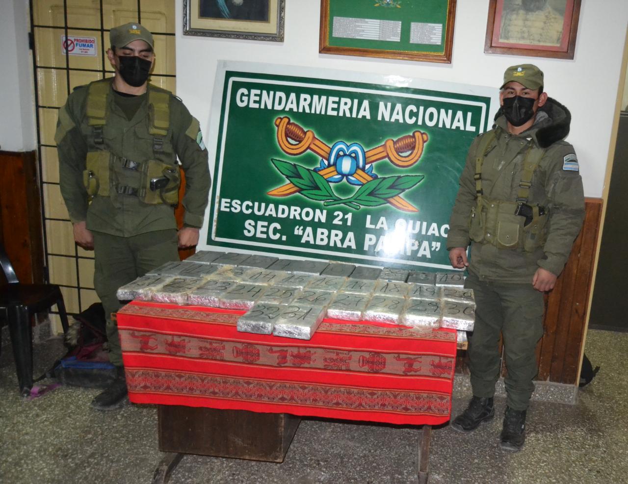 Los funcionarios, ante testigos, contabilizaron 32 paquetes rectangulares que contenían una sustancia pulverulenta blancuzca, la cual fue sometida a prueba de campo Narcotest y arrojó resultado positivo para cocaína, con un peso total de 34 kilos 337 gramos. Los gendarmes decomisaron el estupefaciente en infracción a la Ley 23.737.