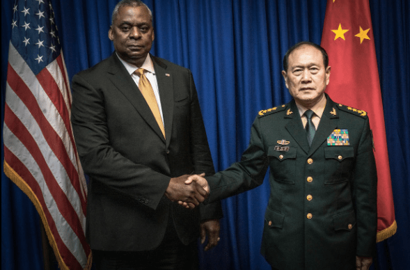 El secretario de Defensa, Lloyd J. Austin III, se reúne con el general Wei Fenghe, ministro de defensa de China, mientras asistía a la reunión de ministros de defensa de la Asociación de Naciones del Sudeste Asiático en Siem Reap, Camboya, el 22 de noviembre de 2022.