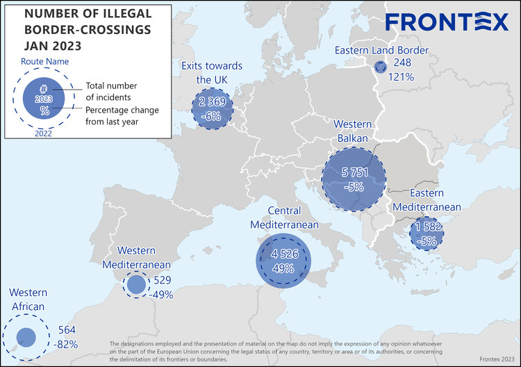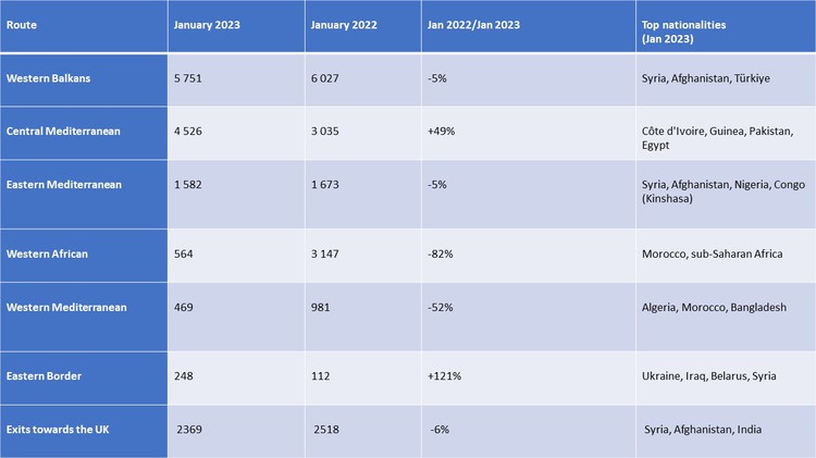 La ruta de los Balcanes Occidentales sigue representando el mayor número de todos los cruces (43% del total en enero), aunque la situación respecto al año 2022 se mantiene prácticamente sin cambios (5% de disminución interanual).
