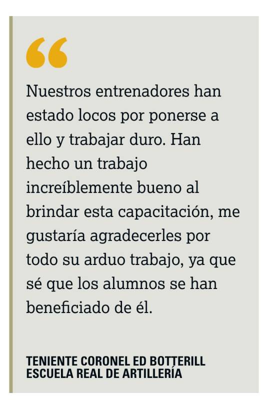 “Ellos también han trabajado duro. Han absorbido todo lo que les hemos enseñado, pero hoy llega a su fin. Se irán de nosotros y dentro de un par de semanas dispararán el AS90 con ira y pondrán en práctica todo lo que han aprendido”, afirmó por último el teniente coronel Botterill.