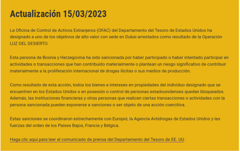A pesar de su arresto, en noviembre de 2022, la investigación mostró que High Value Target continuando con la dirección del tráfico de drogas desde países de origen, en América del Sur, como Brasil, Colombia y Perú, hacia Europa y Australia desde su base en Dubai, Emiratos Árabes Unidos. Al cooperar con otros narcotraficantes internacionales de primer nivel en Dubai, con quienes invirtió conjuntamente en empresas de tráfico de cocaína de varias toneladas, el ciudadano bosnio-herzegoviniano/holandés se convirtió en una figura poderosa en el control del suministro masivo de cocaína hacia Europa y otros destinos. Además, también se sospecha que el High Value Target es responsable de la producción de drogas sintéticas en la Unión Europea (UE).