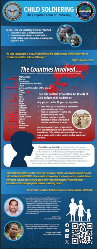 El gobierno de los Estados Unidos reconoce que el reclutamiento de niños como soldados es una forma de trata de personas. El reclutamiento de niños como soldados se produce cuando un grupo armado gubernamental (incluida la policía u otras fuerzas de seguridad), una organización paramilitar, un grupo rebelde u otro grupo armado no estatal recluta o utiliza ilegalmente a niños (mediante la fuerza, el fraude o la coerción), como combatientes o en funciones de apoyo. Esas funciones de apoyo incluyen el desempeño de niños como cocineros, porteros, guardias, mensajeros, médicos, sirvientes o espías.