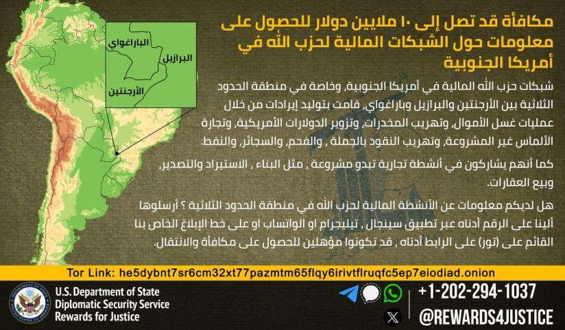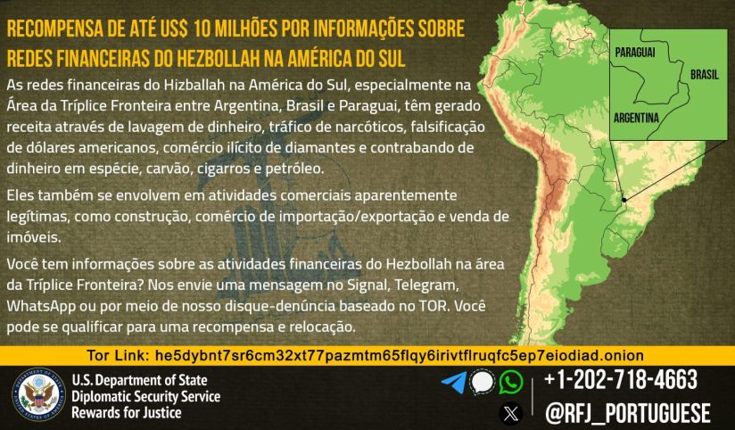 Oipol & Oijust OSINT Global Operation, Cooperación, traducción y edición, mayo 20 de 2025 | Departamento de Estado y Representación Diplomática en Buenos Aires, documentos, fotos e informes, mayo 19 de mayo de 2025.- El programa Recompensas por la Justicia (RFJ) del Departamento de Estado de Estados Unidos, administrado por el Servicio de Seguridad Diplomática, ofrece una recompensa de hasta 10 millones de dólares por información que conduzca a la desarticulación de los mecanismos financieros de la organización terrorista Hizbulá. En virtud de esta recompensa, RFJ solicita información sobre las redes financieras de Hizbulá en la Triple Frontera (TBA) de Argentina, Brasil y Paraguay.