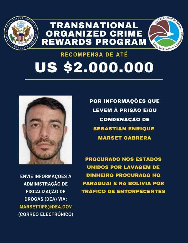 Simultáneamente, el Departamento de Justicia anunció la apertura de un auto de procesamiento que imputa a Marset cargos de lavado de dinero, derivados del movimiento de ganancias del narcotráfico a través de instituciones financieras estadounidenses. Marset también es un fugitivo buscado en todo el Cono Sur de Sudamérica, acusado de delitos de crimen organizado en Paraguay y Bolivia. En agosto de 2023, las autoridades bolivianas anunciaron una recompensa de 100.000 dólares por la captura de Marset.