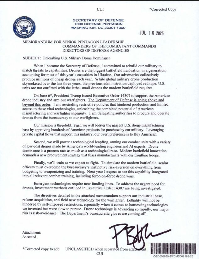 Ese es precisamente el tipo de trabajo relacionado con los drones que el secretario de Defensa [delosEstadosUnidos], Pete Hegseth, impulsó a principios del mes de julio de 2025 en su memorando del 10 de julio » Desatando el Dominio de los Drones Militares de Estados Unidos» Bajo esta directiva, el secretario pretende fortalecer la base de fabricación de drones [estadounidenses], proporcionar a los combatientes las mejores herramientas y garantizar que estén capacitados para usarlas eficazmente.