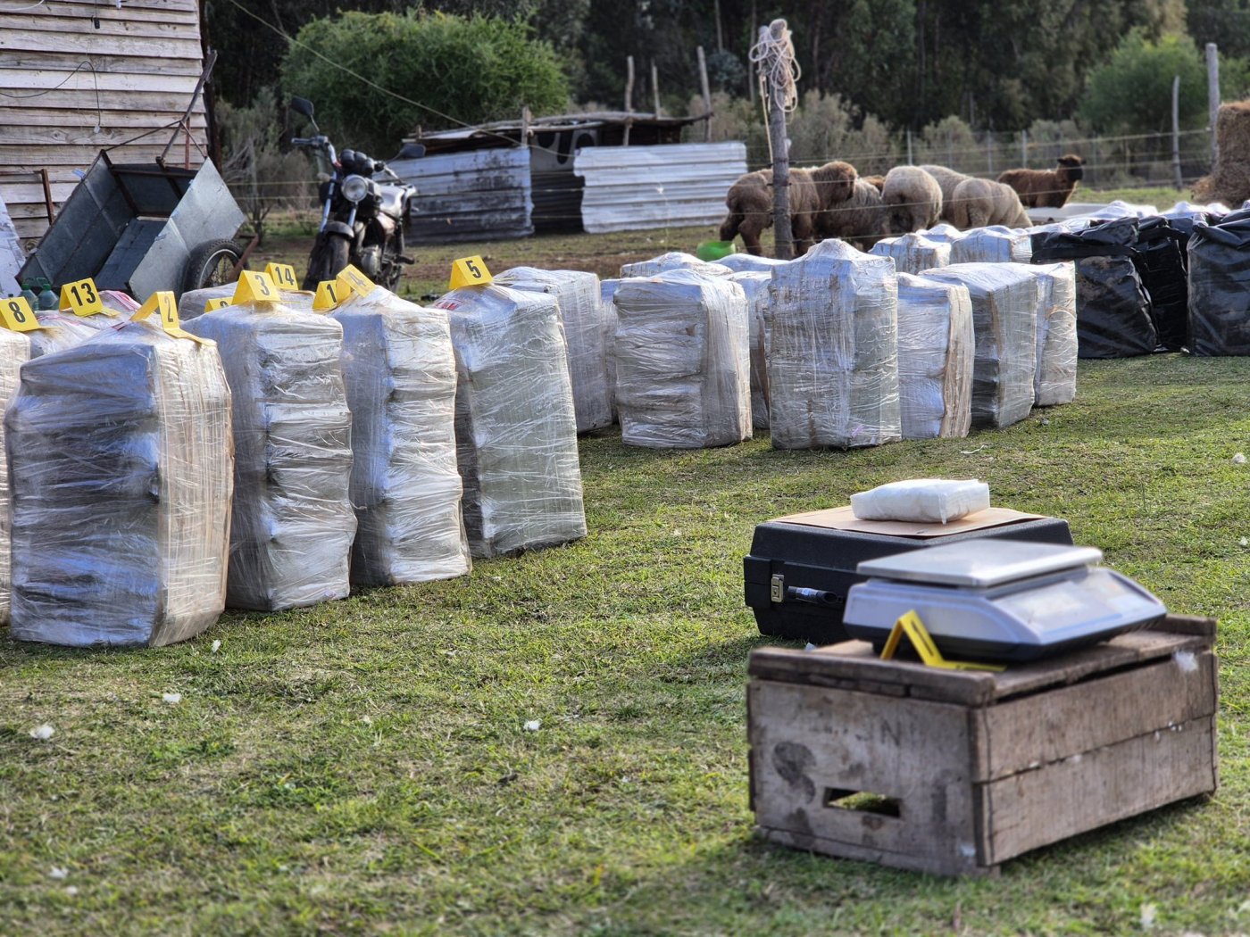 Durante la inspección del galpón del predio, se constató tierra removida en una parte del suelo. Al excavar, se hallaron paquetes ocultos cubiertos con chapas, madera y tierra. Todos estaban envueltos en film y almacenados en bolsos náuticos de color negro.