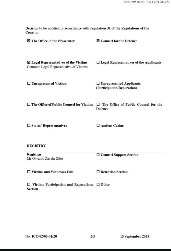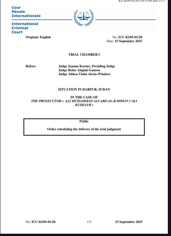 Oipol & Oijust Unidad OSINT, cooperación, traducción y edición, septiembre 21 de 2025 | Corte Penal Internacional (CPI), comunicación, documentación y fotos, septiembre 15 de 2025.- El día 15 de septiembre de 2025, la Sala de Primera Instancia I de la Corte Penal Internacional (CPI) programó la emisión de su sentencia condenatoria o absolutoria en el caso Fiscal contra Ali Muhammad Ali Abd-Al-Rahman (Ali Kushayb) para el 6 de octubre de 2025 a las 14:00 (hora local de La Haya).