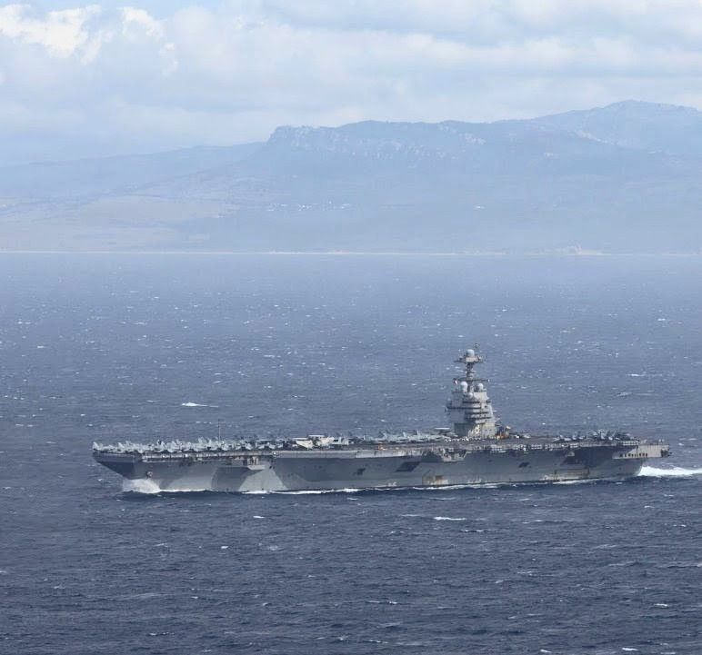 En la imagen, el portaaviones más grande del mundo, el USS Gerald R. Ford (CVN 78), transita el Estrecho de Gibraltar el 04 de noviembre de 2025. El Gerald R. Ford, un portaaviones de primera clase y buque insignia desplegado del Grupo de Ataque de Portaaviones 12, se encuentra en un despliegue programado en el área de operaciones de la 6.ª Flota de Estados Unidos para apoyar la efectividad en combate, la letalidad y la preparación de las Fuerzas Navales de Estados Unidos. (Foto de la Armada de Estados Unidos por la especialista en comunicación de masas de segunda clase Triniti Lersch)