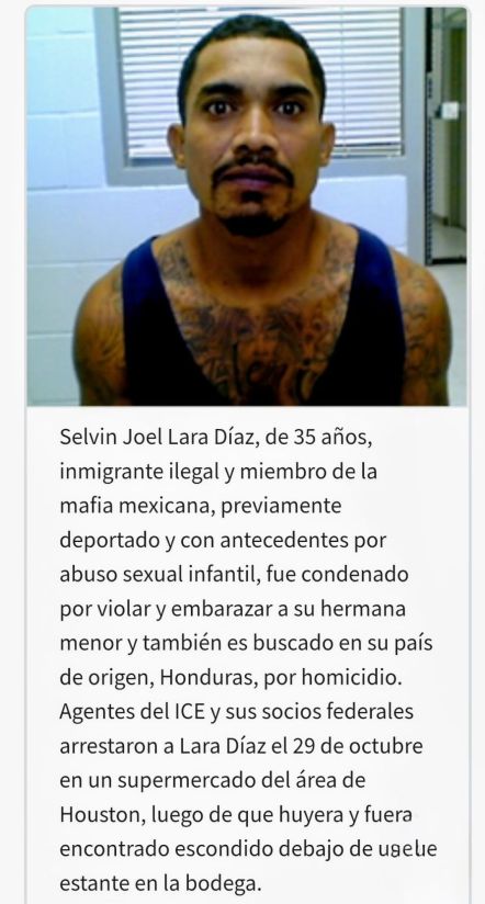 Selvin Joel Lara Díaz, de 35 años, inmigrante ilegal y miembro de la mafia mexicana, previamente deportado y con antecedentes por abuso sexual infantil, fue condenado por violar y embarazar a su hermana menor y también es buscado en su país de origen, Honduras, por homicidio. Agentes del ICE y sus socios federales arrestaron a Lara Díaz el 29 de octubre en un supermercado del área de Houston, luego que huyera y fuera encontrado escondido debajo de un estante en la bodega.