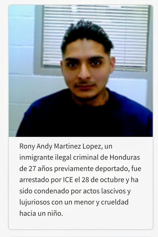 Rony Andy Martinez Lopez, un inmigrante ilegal criminal de Honduras, de 27 años, previamente deportado, fue arrestado por ICE el 28 de octubre y ha sido condenado por actos lascivos, como así también lujuriosos con un menor y crueldad hacia un niño.