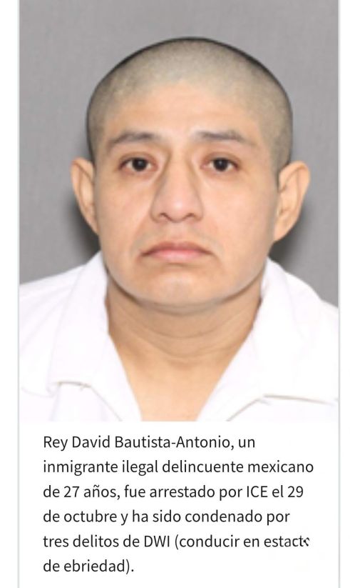 Rey David Bautista Antonio, un inmigrante ilegal delincuente mexicano de 27 años, fue arrestado por ICE el 29 de octubre y ha sido condenado por tres delitos de DWI (conducir en estado de ebriedad).