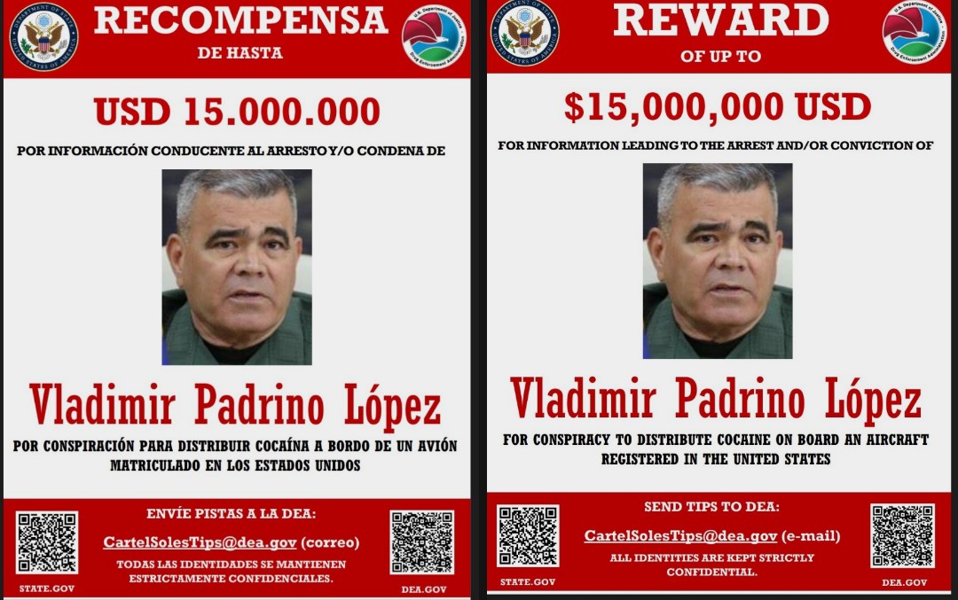 El Departamento de Estado de Estados Unidos ofrece una recompensa de hasta 15 millones de dólares por información que conduzca al arresto y/o condena de Vladimir Padrino López.